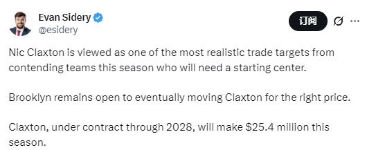 2025-10-05 11:30北京时间10月5日,根据NBA记者Evan Sidery报道,篮网队中锋克拉克斯顿被认为是争冠球队的交易目标,而篮网队对于交易克拉克斯顿持开放态度。