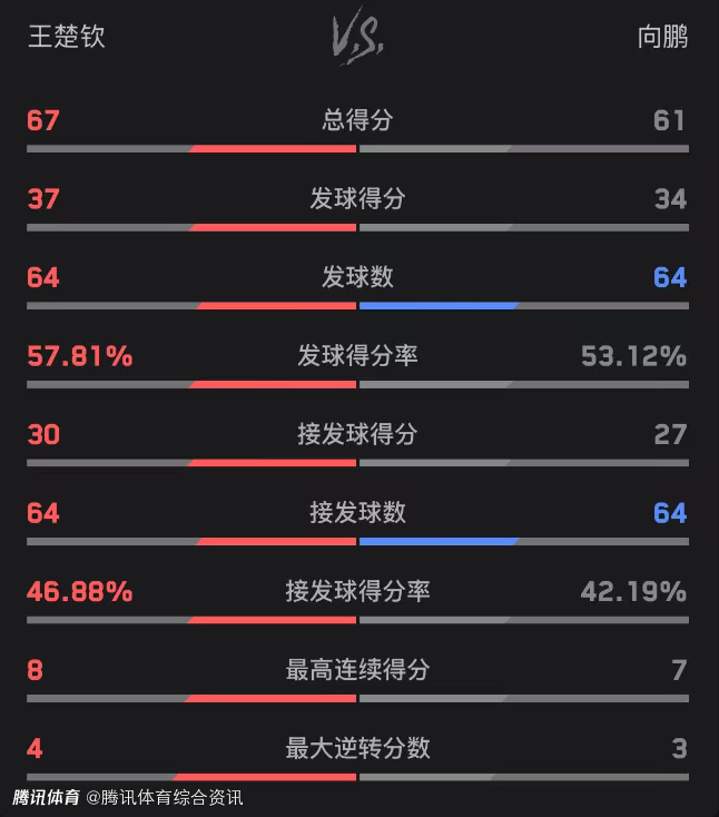 双方技术统计如下(王楚钦在前):总得分67-61、发球得分37-34、发球得分率57.81%-53.12%。