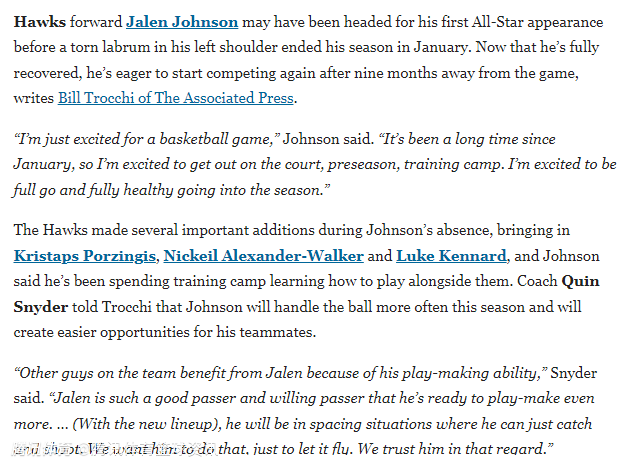 在约翰逊养伤期间,老鹰队完成了多笔重要引援,签下波尔津吉斯、亚历山大-沃克和肯纳德。约翰逊表示,自己在训练营中一直在学习如何与这些新队友配合。