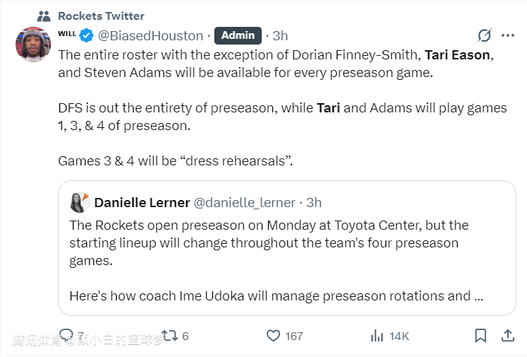 根据《休斯顿纪事报》记者Danielle Lerner与休媒Biased Houston的报道,除了DFS、亚当斯、伊森外其余的球员将参与所有的季前赛比赛,芬尼-史密斯确定缺席所有的季前赛,而伊森与亚当斯将参与季前赛,不过伊森与亚当斯是打1、3、4场。