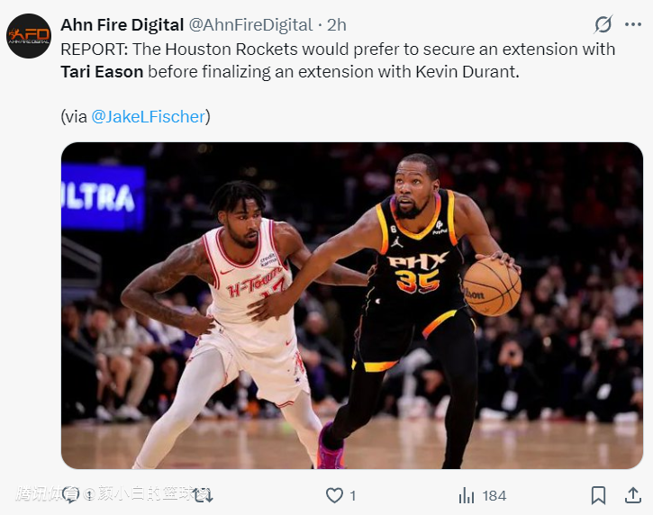 根据BR记者杰克-费舍尔的报道,塔里-伊森正在与火箭队谈提前续约,他的续约优先级是高于凯文-杜兰特的,火箭队希望在续约伊森后再跟杜兰特商讨一份两年的提前续约合同,因为伊森的提前续约时限10月20日已经临近。