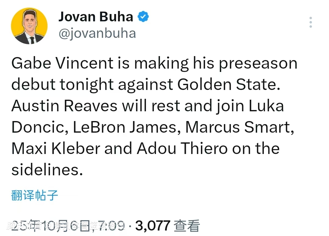 据悉,文森特今天将在对阵勇士队的比赛中完成季前赛首秀。里夫斯将选择轮休,与东契奇、詹姆斯、斯玛特、克勒贝尔以及新秀蒂耶罗一同作壁上观。