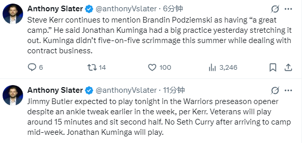赛前,勇士主教练科尔表示,尽管巴特勒本周早些时候扭伤脚踝,但预计他今晚将参加勇士季前赛揭幕战,只打上半场。