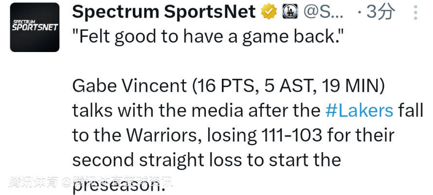 2025-10-06 13:10北京时间10月6日,NBA季前赛继续进行,勇士队111-103击败湖人队。湖人队球员文森特此役出战19分钟,9投4中(三分球7投3中)得到16分5助攻。赛后,文森特接受媒体采访。