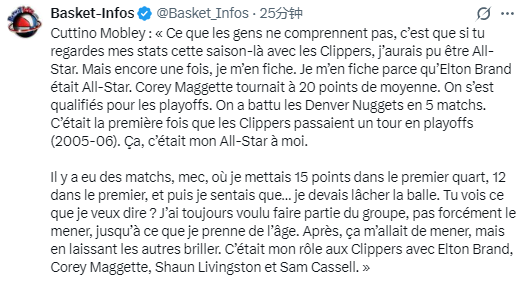 2025-10-07 01:00北京时间10月7日,曾效力于快船队的前NBA球员卡蒂诺-莫布里在接受采访时,谈及自己当年在球队里的定位。