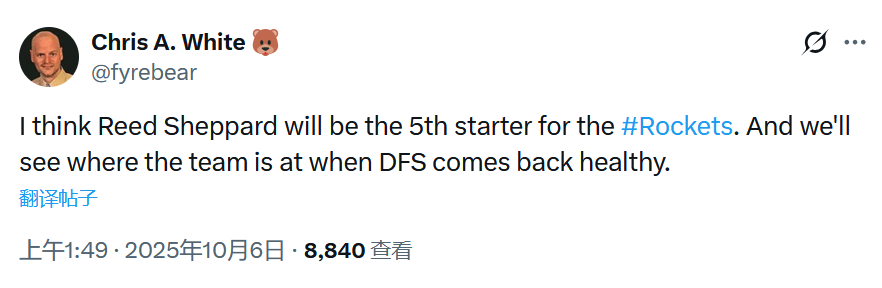 2025-10-07 07:00北京时间10月7日,距离新赛季NBA常规赛开战仅剩下15天的时间。火箭队主帅乌度卡此前透露球队首发已经确定4人,这也使得第5人的人选成为了媒体和球迷猜测的对象,火箭队记Chris A. White表示这个人选可能是谢泼德。
