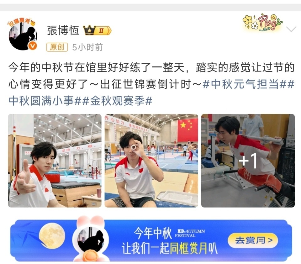 2025-10-07 07:00中秋佳节之际,中国体操名将张博恒在个人社交平台发布状态,声称训练了一整天,踏实的感觉让过节的心情变更好。