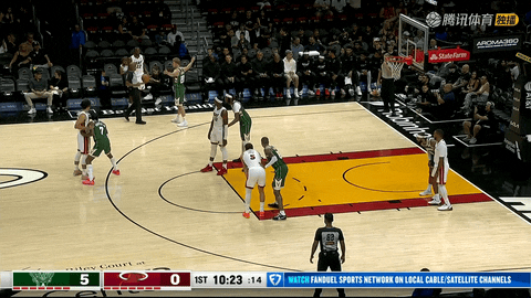 第1节还剩11分02秒时,A.J. 格林接特伦特传球命中外线三分,雄鹿取得5-0的开局。热火没有慌乱,第1节还剩10分18秒时,鲍威尔在圈顶回敬一记三分,比分追至5-3。