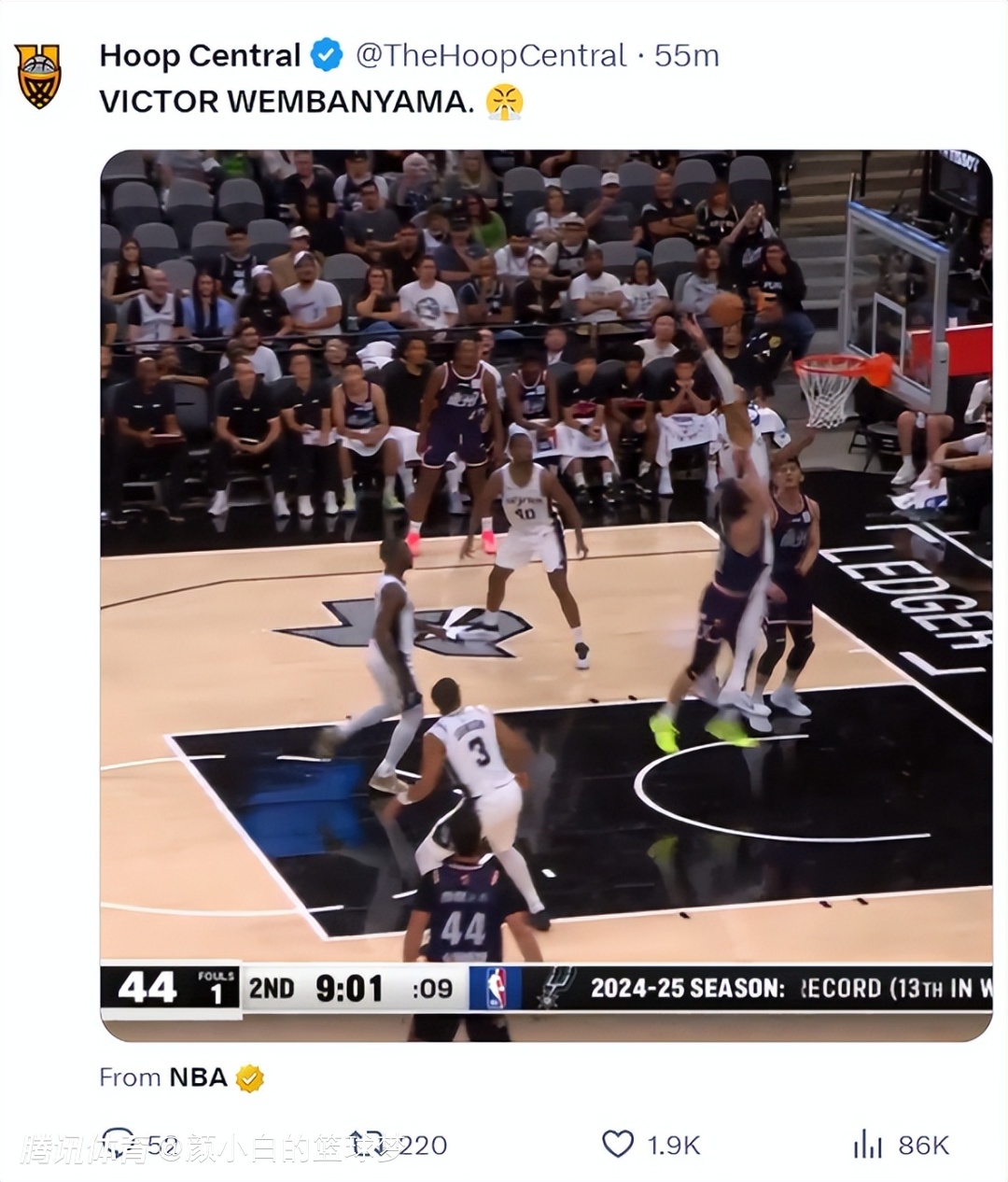 因为马刺这边索汉、福克斯、卡斯尔等多位主力不打,文班亚马成为马刺唯一的亮点,文班亚马首节就送了卡明斯基一个大帽,卡明斯基这个球都已经过了文班亚马一个身位还是被帽掉了!首节文班亚马2中2拿6分8篮板3助攻1盖帽5失误。