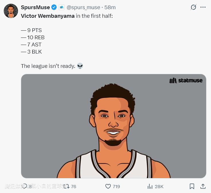 文班亚马第二节命中一个三分球,单节送出两个大帽,3分2篮板4助攻2盖帽1失误,文班亚马这场比赛唯一的话柄就是失误过多。