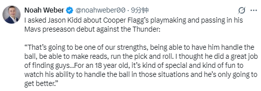 当被问及状元秀库珀-弗拉格的组织进攻与传球能力时,基德表示:“这会成为我们的优势之一,那就是让他持球、判断场上局势、执行挡拆战术。我认为他在寻找队友方面做得非常出色,对于一名18岁的球员来说,他能在这种场合下展现出这样的控球能力,既难得又极具观赏性,而且他只会变得更优秀。”