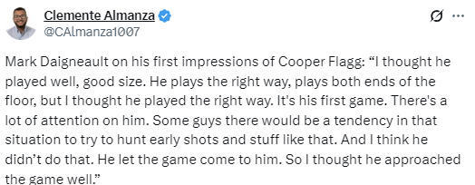 在谈到自己对于库珀-弗拉格的初印象时,戴格诺特说道:“我认为他打得很不错,身材条件出色。他的比赛风格很正确,能兼顾攻防两端,而且我觉得他确实用了正确的方式去打球。这是他的第一场季前赛,外界对他的关注度非常高。换作有些球员,在这种情况下可能会急于出手投篮之类的,但我看他没有这么做。他懂得让比赛节奏自然地融入自己的节奏,所以我认为他对这场比赛的应对方式非常好。”