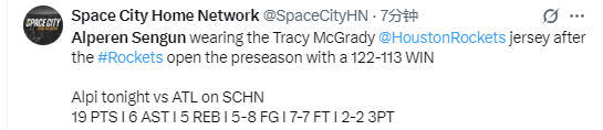 2025-10-07 11:50北京时间10月7日,NBA季前赛继续进行,火箭队122-133击败老鹰队。火箭队球员申京此役出战17分钟,7投5中(三分球2投2中,罚球7罚7中)得到了19分5篮板6助攻2盖帽,在场正负值+18。赛后,申京身穿一件麦迪的火箭1号球衣接受了媒体采访,点评了比赛。