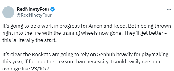 2025-10-07 12:40北京时间10月7日,NBA季前赛继续进行,火箭以122-113战胜老鹰。赛后,火箭队记 RedNinetyFour 在社交平台发文,对球队新赛季的阵容调度与球员定位展开分析。