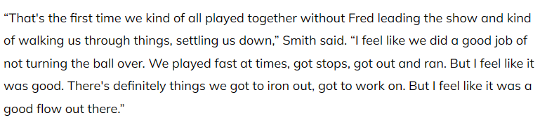 小贾巴里-史密斯还提到:“这是我们第一次在没有范弗利特主导、没有他带我们梳理节奏、稳定心态的情况下一起打球。但我觉得我们做得不错,没有出现太多失误。我们有时能打出快节奏,能完成防守断球,然后快速推反击。整体来看,这次表现挺好的。当然,肯定还有需要改进和加强的地方,但场上的进攻节奏和团队配合是比较顺畅的。”
