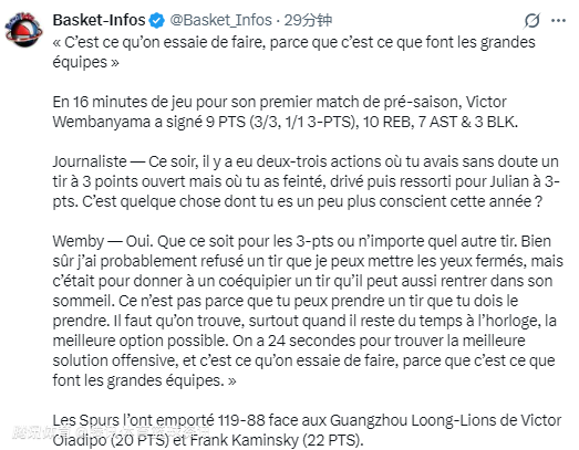 2025-10-07 15:50北京时间10月7日,NBA季前赛继续进行,马刺以119-88轻取广州男篮。在季前赛首秀的16分钟出场时间里,马刺球星文班亚马交出了9分(投篮3中3,三分球1中1)、10个篮板、7次助攻和3次盖帽的亮眼数据。赛后,他接受记者采访。