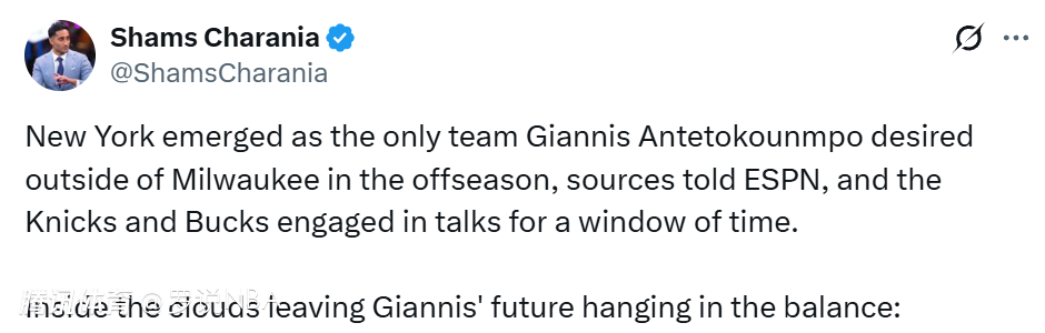 2025-10-07 19:30北京时间10月7日,名记Shams长文报道了字母哥,透露这位希腊巨星除了雄鹿,只愿意效力纽约尼克斯。尼克斯和雄鹿也曾在8月份进行过关于字母哥的交易谈判,只是最终未能取得进展。