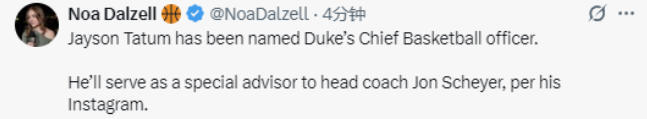 该记者写道:“杰森-塔图姆被任命为杜克大学首席篮球官。根据他的Instagram账号消息,塔图姆将担任球队主教练乔恩-沙耶尔的特别顾问。”