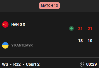 第二局比赛,韩千禧适应对手打法后,开局轰出8-0领先,并以11-4进入技术暂停,战成19-10后,韩千禧连得2分,以21-10再下一城,大比分2-0淘汰对手晋级。