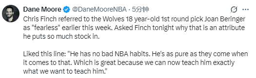 2025-10-08 07:50北京时间10月8日,森林狼主帅克里斯-芬奇在接受采访时曾用无所畏惧形容球队18岁的首轮秀贝林格。