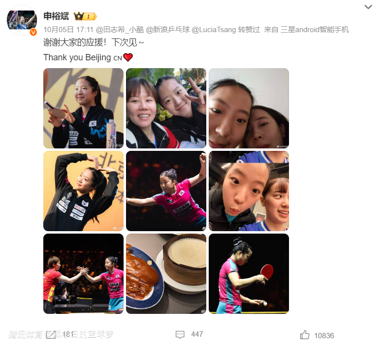 申裕斌绝对是韩乒里面最忙碌的,她在WTT北京大满贯打进四强,10月4日打完最后一场比赛,10月5日刚刚返回韩国,10月7日又从韩国飞往印度,申裕斌的休息时间也非常之少。