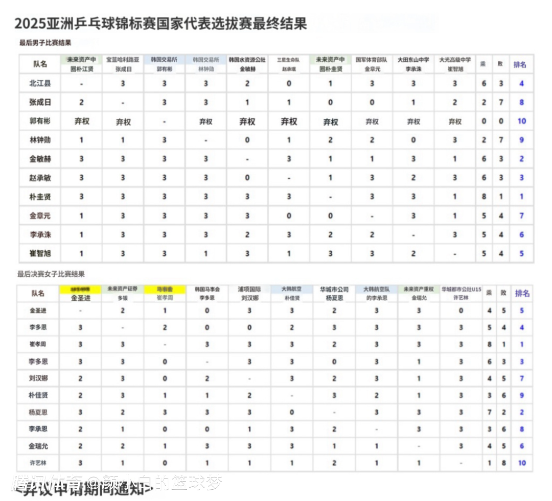 女团这边崔孝珠、梁夏银两人是通过选拔赛确定亚锦赛名额,崔孝珠拿到8胜1负,梁夏银拿到7胜2负,这两人以第一、第二的身份锁定了亚锦赛名额。