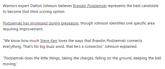2025-10-08 09:20北京时间10月8日,勇士队记Dalton Johnson认为,波杰姆斯基是成为球队第三得分点的最佳人选。