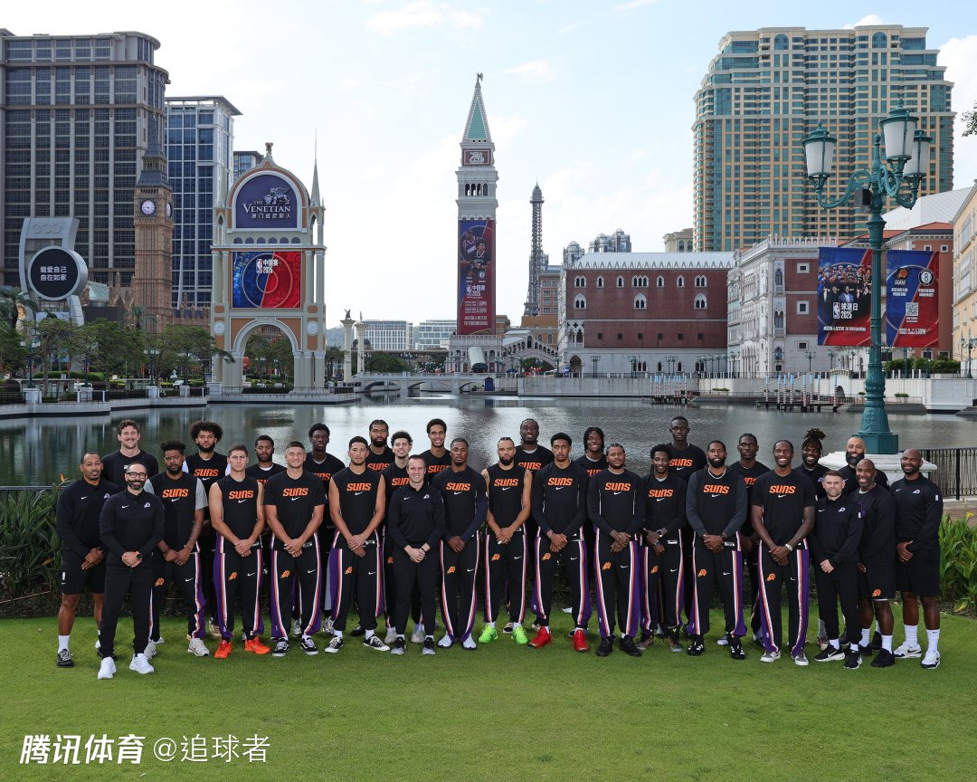 太阳全队身穿训练服在澳门合影留念,狄龙-布鲁克斯满脸严肃地站在C位十分醒目,布克则是与阿伦并肩站在一起。