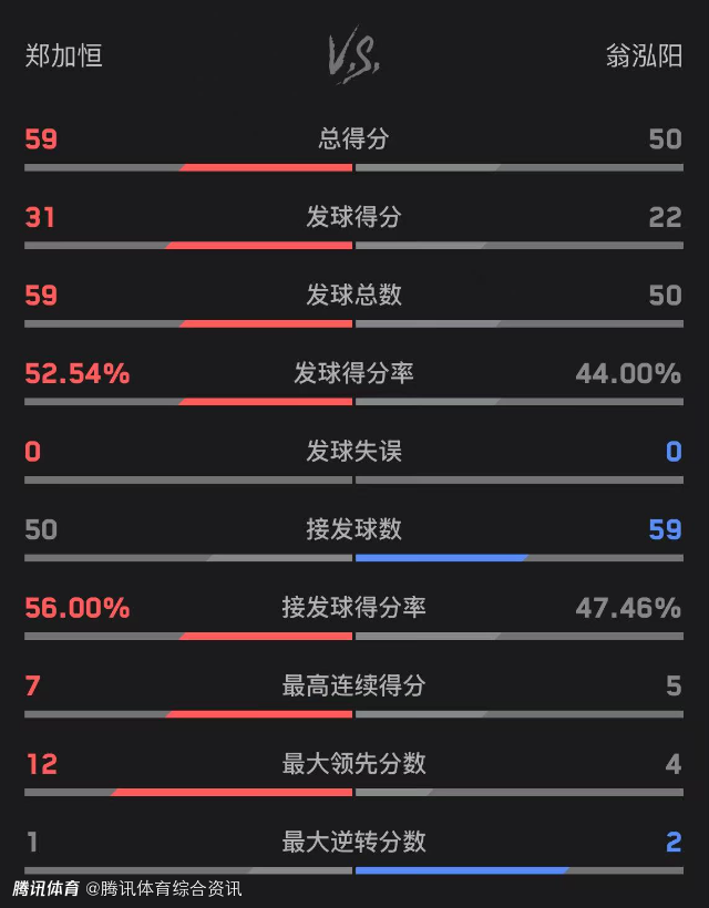 双方技术统计如下(翁泓阳在前):总得分50-59、发球得分22-31、发球得分率44%-52.54%。