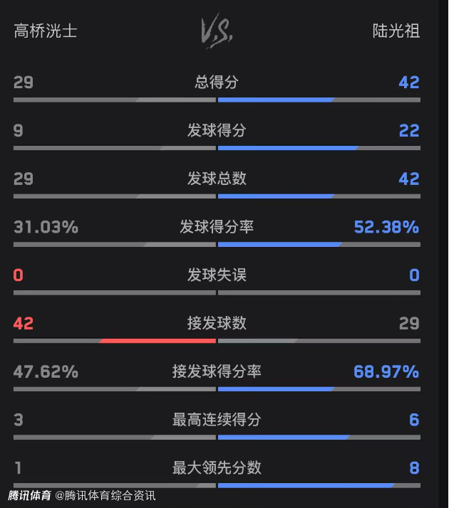 双方技术统计如下(陆光祖在前):总得分42-29、发球得分22-9、发球得分率52.38%-31.03%。