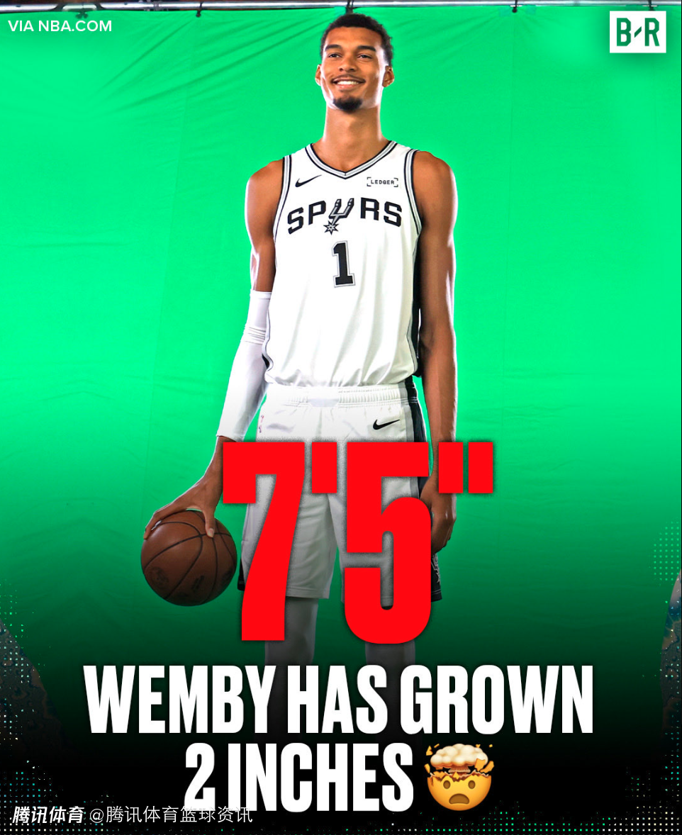 真长个了!NBA和马刺官方已将文班亚马身高更新为2米26 此前为2米21