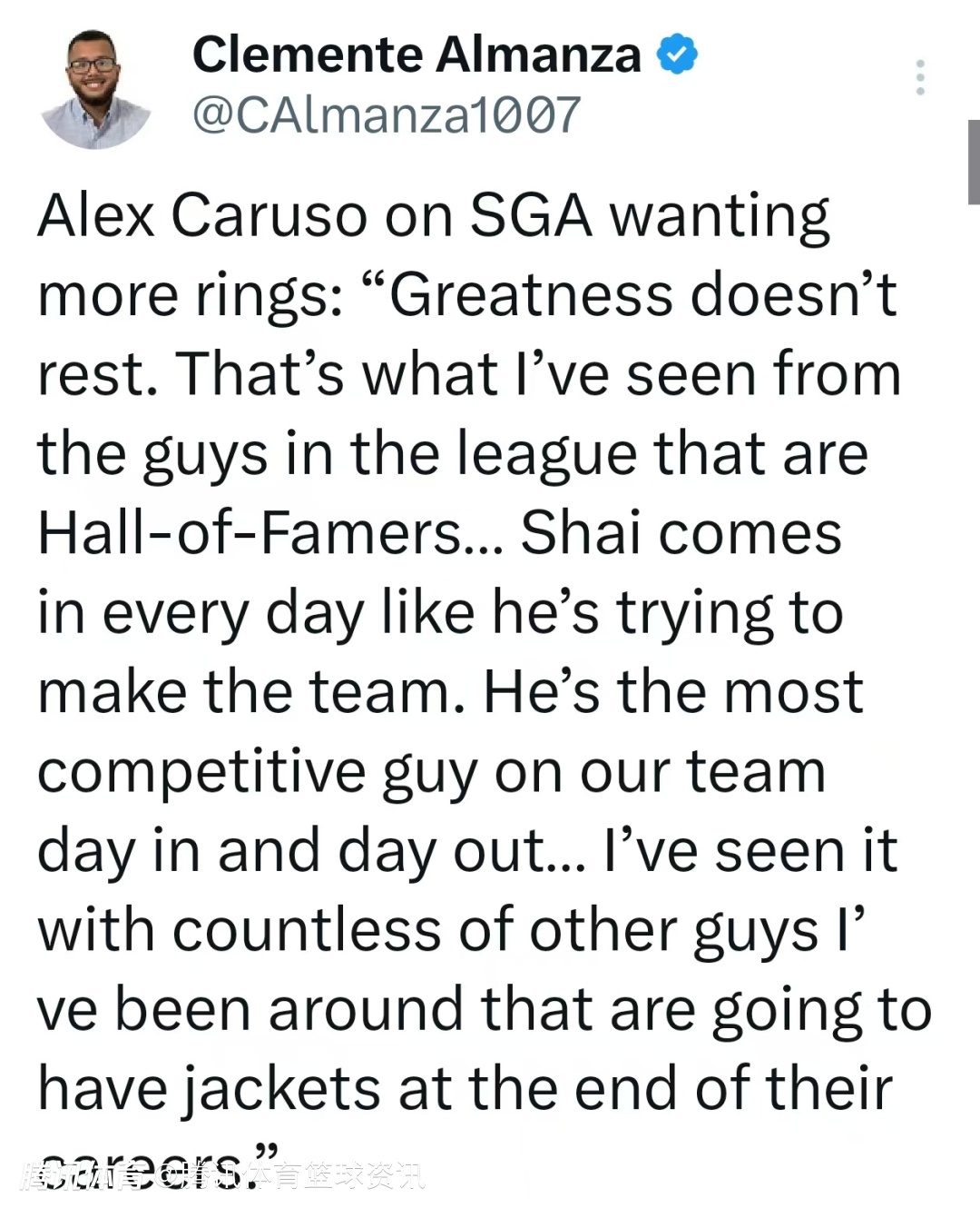 当被问及亚历山大渴望更多冠军戒指时,卡鲁索评价道:“伟大从不止步,这是我从联盟里那些名人堂级别球员身上看到的特质。亚历山大每天训练都像在争取进入球队大名单一样拼。他是我们队里每天竞争心最强的人,我在身边很多最终能入选名人堂的球员身上,都看到过这种劲头。”