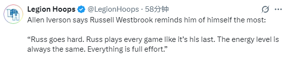 艾弗森解释说:“威少最像我的地方在于他那股子全力以赴的劲头。无论比赛何时何地,威少都像在打最后一场球一样拼命,能量从不掉线,始终全情投入。”