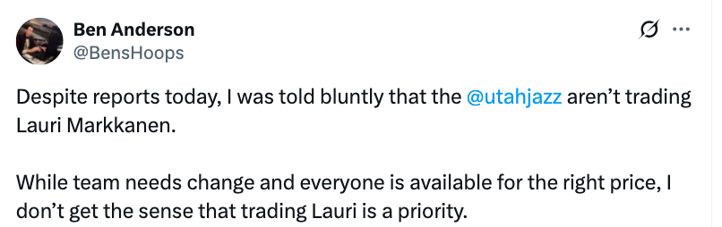 不过爵士队记Ben Anderson则是在线辟谣:“尽管今日有流言传出,但我得到明确消息,爵士目前没有交易马尔卡宁的计划。虽然球队需求会变化,任何球员都可能因合适的报价被摆上货架,但现阶段爵士管理层并未将交易马尔卡宁视为优先考虑选项。”