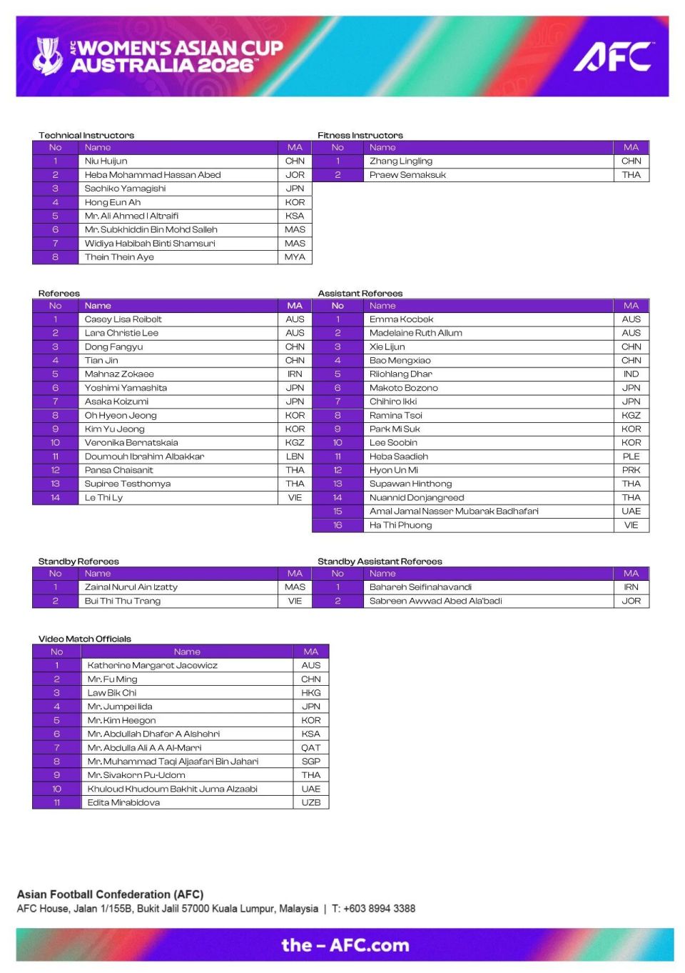 名单中共有45名裁判员,比上届多了13人,为历届赛事最多,视频助理裁判(VAR)系统将首次全程启用,包括小组赛阶段,标志着亚洲女足赛事执裁标准的重要升级。