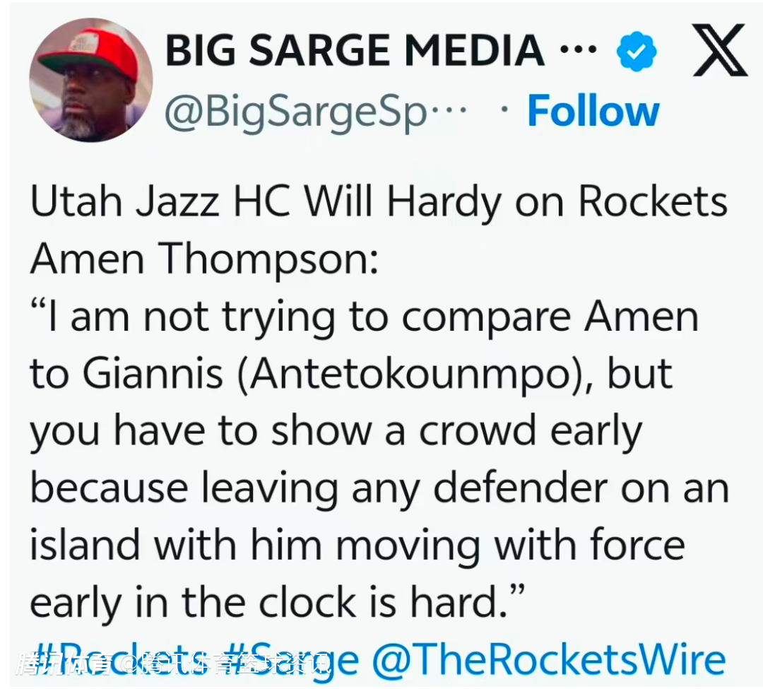 2025-10-09 14:20北京时间10月9日,NBA季前赛继续进行,火箭以140-127战胜爵士。本场比赛中,火箭球员阿门-汤普森出战25分钟,全场15投9中,得到19分7篮板6助攻2抢断1盖帽。,其中首节打了10分钟就得到6分6篮板2助攻1抢断。赛后,对手主帅哈迪在接受采访时提及他的表现。