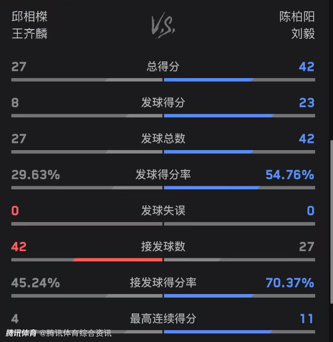 双方技术统计如下(陈刘组合在前):总得分42-27、发球得分23-8、发球得分率54.76%-29.63%。