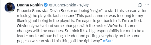 在谈到上赛季无缘季后赛后,自己带着怎样的渴望开启新赛季时,布克说道:“对我来说,上赛季没能打进季后赛,这个夏天实在太漫长了。我迫切想回到赛场,心里充满期待。显然,我们的阵容有了一些变动,教练组也进行了调整。所以我认为,作为领袖,我肩负着重大责任。我要继续履行好领袖职责,让所有人达成共识,这样我们才能以正确的方式开启新赛季。”