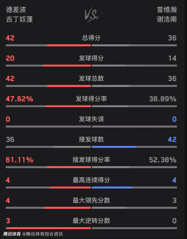 双方技术统计如下(谢浩南/曾维瀚在前):总得分36-42、发球得分14-20、发球得分率38.89%-47.62%。