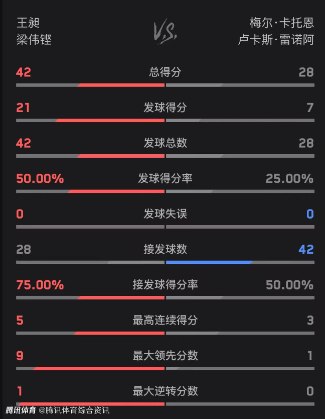 双方技术统计如下(梁王组合在前):总得分42-28、发球得分21-7、发球得分率50%-25%。