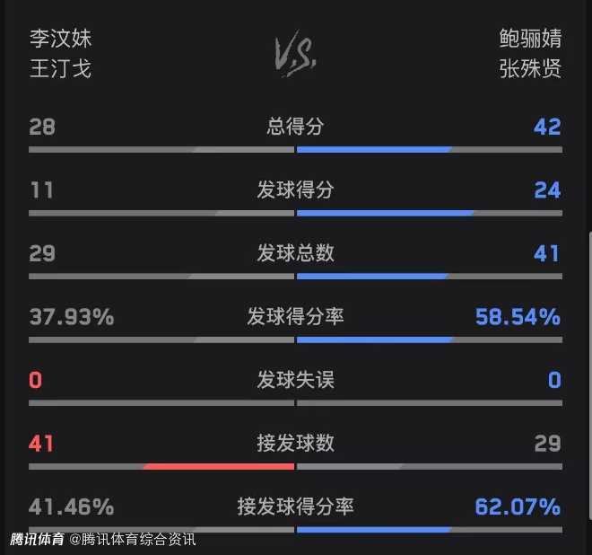 双方技术统计如下(鲍骊婧/张殊贤在前):总得分42-28、发球得分24-11、发球得分率58.54%-37.93%