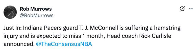 在步行者季前赛首战森林狼的比赛中,麦康奈尔在第二节脚步踉跄被替换下场,随后返回更衣室治疗,之后便没再回归。伤退前,他替补出战8分钟,3投全中拿到7分2篮板3助攻1抢断。