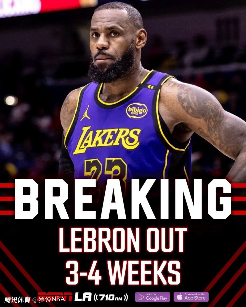 即将开启个人NBA历史第23个赛季的詹姆斯,将因这次伤病,被迫缺席球队的新赛季开局的比赛。湖人队表示,未来3至4周内不会对他的伤情进行重新评估。