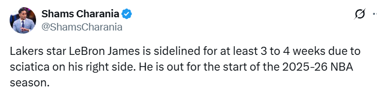 2025-10-10 06:30北京时间10月10日,据名记Shams报道,湖人球星詹姆斯因右侧坐骨神经痛,将至少休战3至4周。这意味着他将缺席2025-26赛季的赛季初段比赛,预计无缘对勇士的揭幕战。