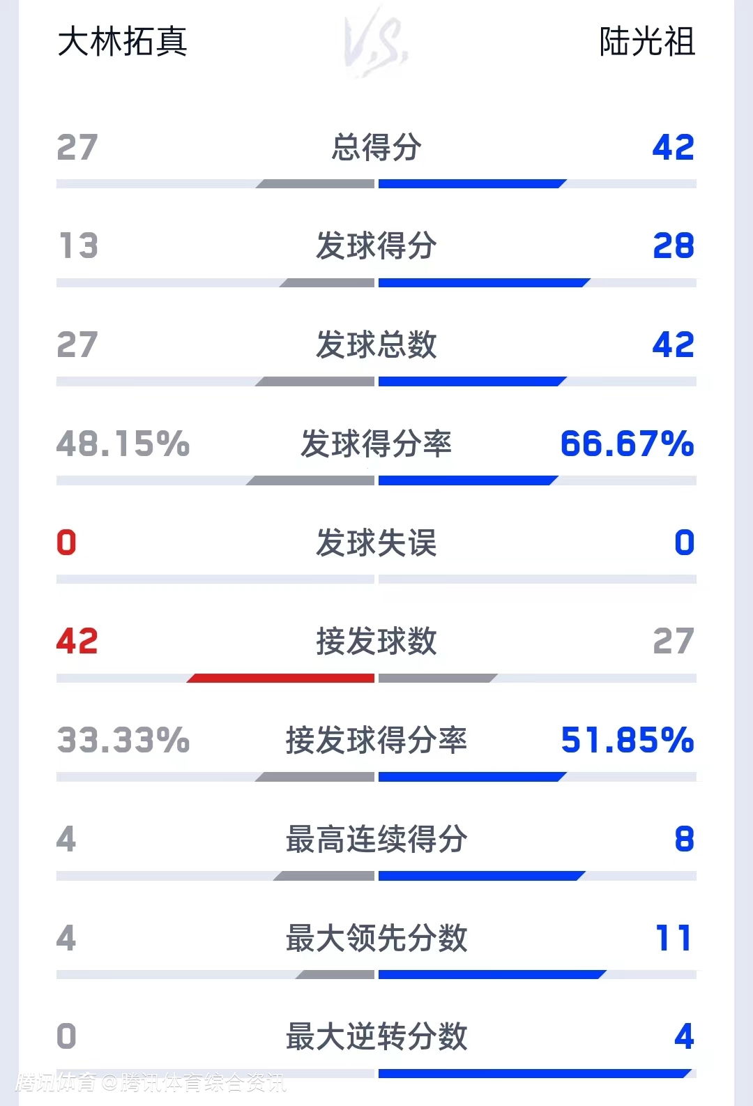双方技术统计如下(陆光祖在后):总得分27-42、发球得分13-28、发球得分率48.15%-66.67%。