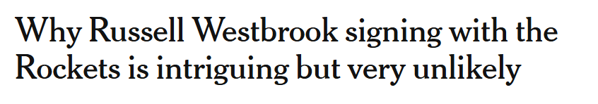 知名美媒The Athletic表示威少加盟火箭的可能性极低,并列出了三大原因——