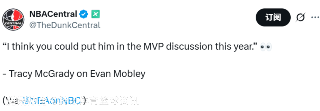 2025-10-10 09:00北京时间10月10日,近日在NBC的节目中,前NBA球星麦迪谈到了骑士的年轻球员莫布利,他表示:“我觉得莫布利新赛季可以被放入MVP的讨论范围了。”