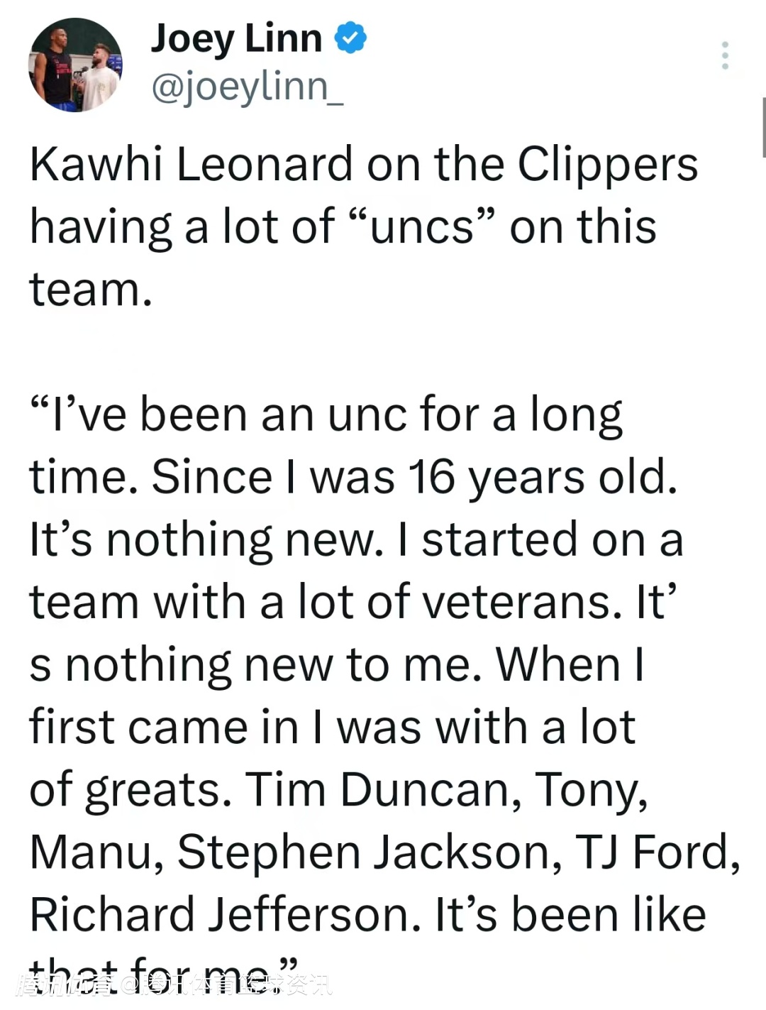莱昂纳德还谈及快船队中有许多老将的现状:“我当老大哥已经很久了,从16岁就开始了。这没什么新鲜的。我最早就在老将云集的马刺队打球,对我来说这很平常。刚进联盟时,我身边就有很多传奇球员——邓肯、帕克、吉诺比利、斯蒂芬-杰克逊、TJ-福特、理查德-杰弗森。我一直都处在这样的环境里。”
