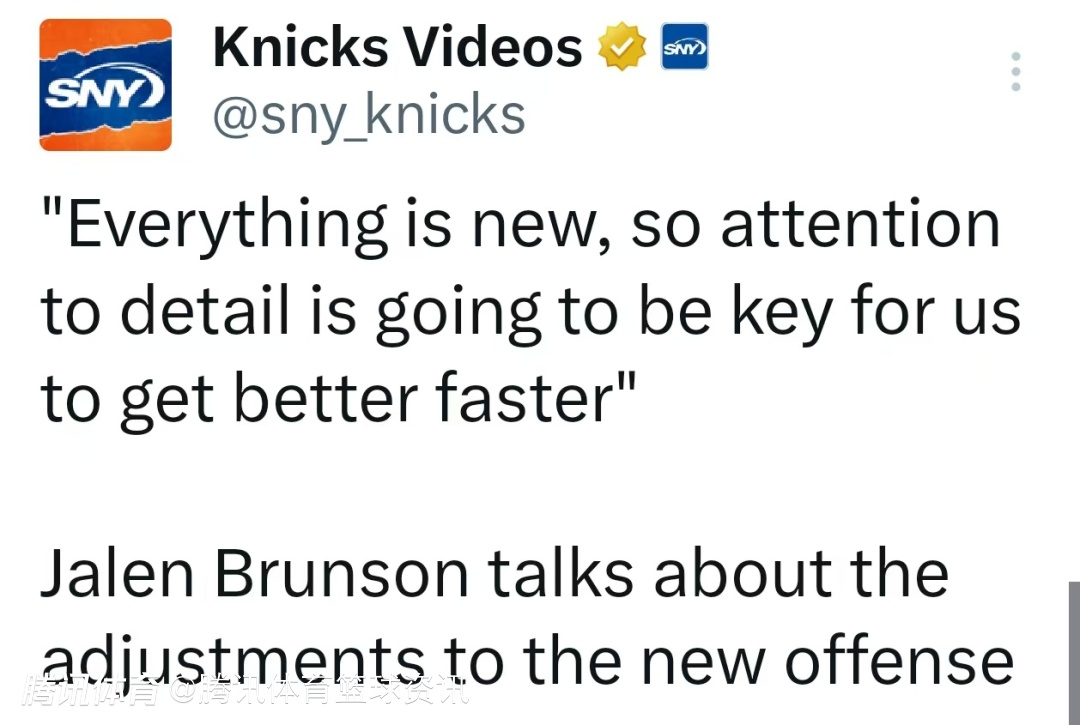 布伦森:尼克斯正在打磨新进攻体系 注重细节是更快提升关键