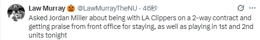 在谈到自己在今夏被裁,随后又与快船队签下双向合同的感受时,米勒说道:“这确实很艰难。你没法说那段时光对我来说很轻松,但要知道,这就是生意场,NBA始终是一门生意。我能做的就是保持积极心态,努力训练。这话听着可能有点老套,但说实话,我当时真的只能这么做。总不能一味抱怨、垂头丧气,对吧?我清楚自己目前的角色,但显然,我希望能承担更重要的职责,所以我一直在为此努力。想回到这里的原因也很简单,就是这里的人对我的态度。就像我之前说的,之前被裁是球队的商业决策,我不会往心里去。从整个球队组织来看,这里有一种家庭般的归属感。能听到大家对我的认可,我真的很开心。”